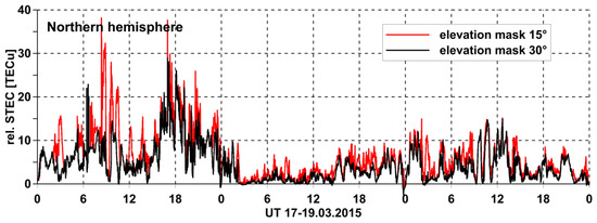 Variations of maximal relative STEC values according to the northern hemisphere sector given in Figure 7, as derived for two employed elevation cut-off angles.