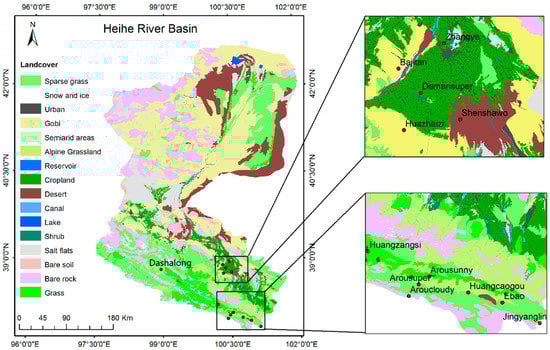 Land cover map of the Heihe River Basin, with zooms showing the spatial distribution of the measurement sites.