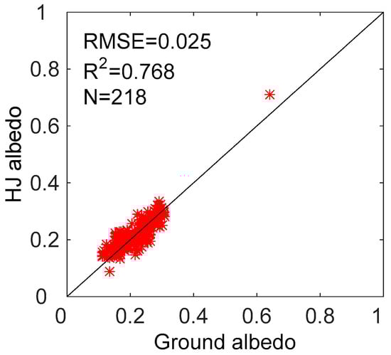 To take the surface heterogeneity of these sites into account, 23 Huan Jing (HJ) satellite sensor imageries on cloud-free days were acquired throughout the year 2013. The HJ-1A/B satellites have a 30 m spatial resolution and a revisiting circle of less than 2 days. The charge-coupled device (CCD) cameras aboard the HJ satellites collect 4-band images ranging from 430 nm to 900 nm. They were transformed into shortwave albedo values with the angular bin (AB) model [,], which estimates the surface albedo directly from the reflectance of one single HJ satellite observation. In addition, there is no BRDF generation during the albedo inversion process. The black-sky albedo (BSA) and white-sky albedo (WSA) were both calculated, and the actual albedo or blue-sky albedo can be estimated by weighting the BSA and WSA with the diffuse fraction of solar radiation arriving at the ground. The diffuse ratio is dependent on the solar zenith angle (SZA) and the atmospheric optical depth (AOD). The AOD information was obtained from MODIS 10 km aerosol products (Collection V005, at 550 nm). The high spatial resolution of 30 m renders it capable of capturing the details and subtle changes of surface albedo within the coarse pixels. Both Peng et al. [] and Wu et al. [] have demonstrated the acceptable quality of HJ albedo with an absolute error around 0.02. Furthermore, the HJ albedos were compared with the ground albedos throughout the experimental period (Figure 2), displaying an absolute accuracy (RMSE) of 0.025 and a coefficient of determination (R2) of 0.768. Despite its reliability, the calibration procedure was still carried out using the linear regression relationship between ground albedo and HJ albedo to reduce errors in the high-resolution albedo map. The HJ albedo was first used to quantitatively assess the surface heterogeneity of ground sites, and then to function as a bridge between coarse-scale albedo products and ground albedo for sites with serious heterogeneity.