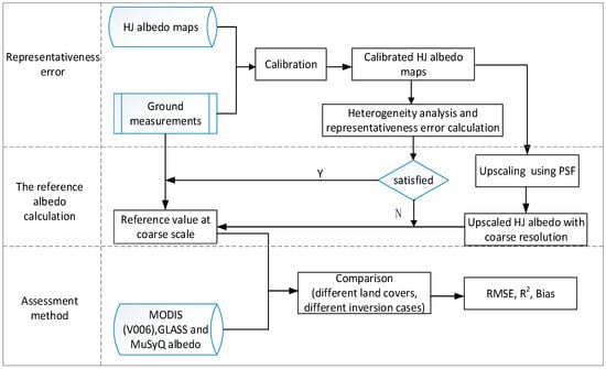 The ground site heterogeneity was first assessed, and representativeness errors of ground-observed albedo with respect to satellite coarse-pixel albedo were estimated to provide more critical constraints on the direct comparison between ground-observed albedo and satellite albedo products, narrowing down the uncertainty caused by spatial scale difference. Then, the reference value at a coarse-pixel scale was determined either directly using the ground-observed albedo or using the high-resolution albedo maps as the upscaling bridge. At last, the MCD43A3 (V006), GLASS and MuSyQ albedos were assessed over different land cover types with consideration of different inversion qualities.