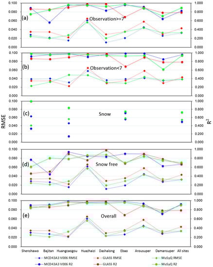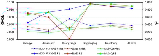 When combining all inversion cases, the MCD43A3 and MuSyQ albedos still show the same average RMSEs of 0.034 and nearly identical average Biases (−0.016 and −0.014, respectively) (Figure 4e and Figure 5e). The R2 values for MCD43A3 and MuSyQ are almost equal (0.920 and 0.903, respectively), which indicates the similarly high overall accuracies of these two albedo products. The GLASS albedo is largely different from MCD43A3 and MuSyQ albedos, with a larger overall RMSE of 0.043 (Figure 4e). Furthermore, the variabilities of RMSEs and R2 for GLASS albedo are larger than those of MCD43A3 and MuSyQ albedos throughout these sites (Figure 6d).