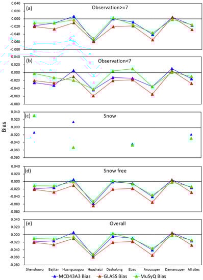 Over the snow-free period, the MCD43A3 and MuSyQ albedos show nearly identical average RMSEs (0.032 and 0.033, respectively) and Biases (−0.016 and −0.014) as presented in Figure 4d and Figure 5d, demonstrating their equivalent performances in describing the magnitude of surface albedo. However, both the RMSE and Bias of MCD43A3 are more variable throughout these sites than those of MuSyQ albedo (Figure 6c), indicating the more stable behavior of MuSyQ albedo. Also, the average R2 of MuSyQ albedo is slightly larger and more stable than MCD43A3, indicating the better consistency of MuSyQ albedo with respect to the ground measurements (Figure 4d). These results are in line with the situation when sufficient observations (>7) are available as shown previously. The GLASS albedo generally displays larger RMSEs than MCD43A3 and MuSyQ albedo with an exception of Huangcaogou and Damansuper sites, resulting in the largest average RMSE of 0.043 (Figure 4d), again for the Bias (Figure 5d). It can be concluded that during the snow-free period, the MCD43A3 and MuSyQ albedos are more accurate than the GLASS albedo in characterizing the magnitude of surface albedo. However, when it comes to the consistency with ground measurements, the GLASS albedo is comparable to MCD43A3, indicated by their similar ranges and distributions of R2 in Figure 6c.