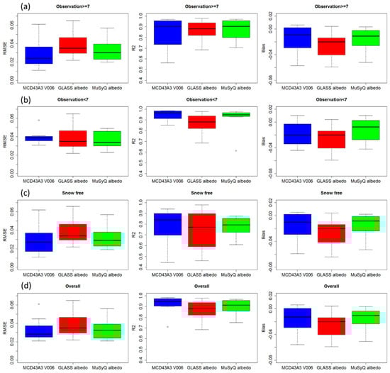 Box plots of the RMSEs (left), R2 (middle), and Biases (right) from the direct comparison with ground-observed albedo in different inversion cases throughout the sites with small representativeness errors: (a) Observation ≥ 7, (b) Observation < 7, (c) Snow free, (d) Overall.
