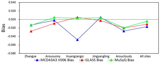 At stations where there is a smaller seasonal variation in albedo throughout the year (i.e., Zhangye, Arousunny), the MuSyQ albedo displays the smallest RMSEs (0.022 and 0.018, respectively). The product followed is MCD43A3, with little larger RMSEs of 0.027 and 0.022, respectively. The product ranks last is the GLASS albedo, with the largest RMSEs of 0.034 and 0.025, respectively (Figure 7). Similar but not identical results can be found in Bias (Figure 8), where the magnitude of Bias is the smallest for MCD43A3 and the largest for GLASS albedo. These quantitative results demonstrate similarly high accuracies of MuSyQ albedo and MCD43A3, being superior to GLASS albedo in magnitude with respect to the aggregated calibrated HJ albedo at the corresponding pixel scales.