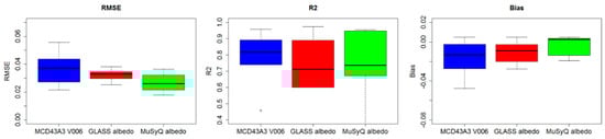 From the results for the case of more than seven observations being available, it is concluded that the MuSyQ albedo and MCD43A3 work equally well in terms of their average closeness to the ground measurements. Nevertheless, the MCD43A3 has more variable RMSEs and Biases regarding their distributions throughout these sites (Figure 6a), indicating that the MuSyQ albedo shows a more stable behavior over different land cover types. Furthermore, the MuSyQ albedo is more consistent with ground measurements than MCD43A3 regarding the distribution of R2 as well as their average values (Figure 6a and Figure 4a). One possible explanation is that the algorithm of MuSyQ albedo enables more observations and a wider angular range for a roust BRDF retrieval. The GLASS albedo is inferior to MCD43A3 and MuSyQ in terms of the closeness to ground measurements. The results are reasonable because when there are sufficient reflectance observations for BRDF modeling, the albedo generations based on BRDF allow a more accurate specification of land-surface albedo []. The GLASS albedo, however, is estimated directly from a single reflectance, which is suboptimal at capturing the anisotropic reflectance behavior. Furthermore, the STF adopted by GLASS albedo may also weaken its ability to characterize the magnitude of surface albedo. Despite the inferiority of GLASS albedo, it still provides a satisfactory accuracy.