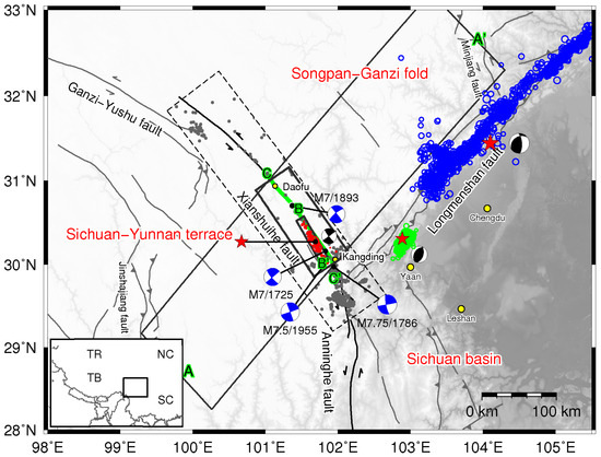 Seismogenic environment and historical earthquakes of the segment of the Xianshuihe fault between Daofu County and Kangding City (SDK). The colored line represents the SDK trace, solid black lines represent faults along the Xianshuihe–Xiaojiang fault system (XXFS), and gray lines denote the active boundary faults in the region. Red stars and black beachballs represent the epicenters and focal mechanisms of the 2008 Mw 7.9 Wenchuan earthquake, the 2013 Mw 6.6 Lushan earthquake, and the 2014 Mw 6.2 Kangding earthquake, respectively. Blue beachballs indicate the focal mechanisms of historical earthquake with M ≥ 7 (adapted from [3]). Yellow circles show cities in this region. Red, green, and blue circles show the aftershocks of the Kangding, Lushan, and Wenchuan earthquakes, respectively. Gray dots indicate earthquakes with Mw > 2.0 since October 2008. A–A’ represents our studied region. B–B’ and C–C’ represent the earthquake depth profiles for the following cross-section views. TR: Tarim Basin; NC: North China; TB: Tibet; SC: South China.