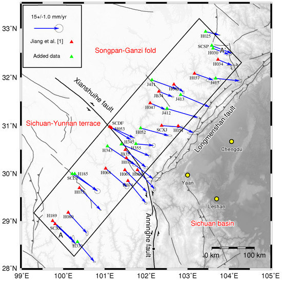 It is noted that three moderate–strong earthquakes, that is, the 12 May 2008 Mw 7.9 Wenchuan earthquake, the 20 April 2013 Mw 6.6 Lushan earthquake, and the 22 November 2014 Mw 6.2 Kangding earthquake, occurred around our studied region between 1999 and 2017. We use the strategies of Liang et al. [31] and Gan et al. [38] to remove the co-seismic impact of these earthquakes on the relevant velocity field: First, the co-seismic displacement and uncertainty of each GPS station are estimated with an elastic dislocation model. Then, for the stations whose co-seismic displacement estimates are equal or greater than 3 mm, we add three co-seismic displacement parameters when solving the velocity field.