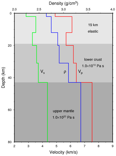 Viscoelastic layered model used in this study. Vp is the P wave velocity, Vs is the S wave velocity, and ρ is the density. The viscosities of the lower crust and upper mantle are set at 1.0 × 1019 Pa·s and 1.0 × 1020 Pa·s, respectively.