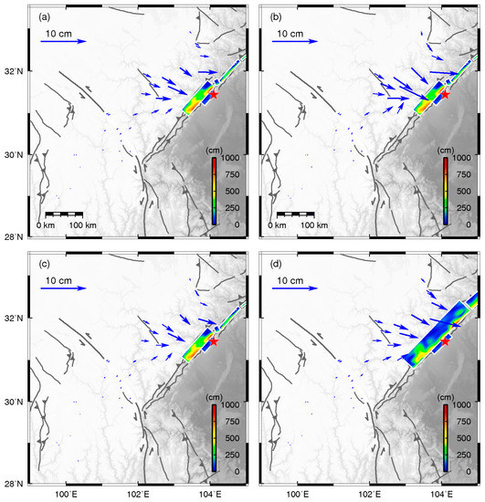 Cumulative post-seismic relaxation effect and slip model of the 2008 Mw 7.9 Wenchuan earthquake. The model with (a) original parameters; (b) different viscosities of lower crust (2.0 × 1019 Pa·s) and upper mantle (5.0 × 1019 Pa·s); (c) different effective elastic thickness (14 km); and (d) different slip model (Diao et al. [48]). Blue arrows indicate the impact of the earthquakes in the studied region, and the red star represents its epicenter.