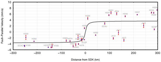 We reexamine the updated GPS data pertinent to the determination of relative motion along the SDK. When measuring the crustal deformation across a section where the fault may be locked, it is vital to confirm that the measurements extend far enough beyond the fault to span the region of strain accumulation, to at least several times the locking depth [9,13]. Based on historical seismicity records and paleoseismological studies [2,3], we deduce that the dip angle of SDK is close to 90°. Therefore, we conduct our study on the basis of the simple screw dislocation model [7,9,56,57,58] using the expression: