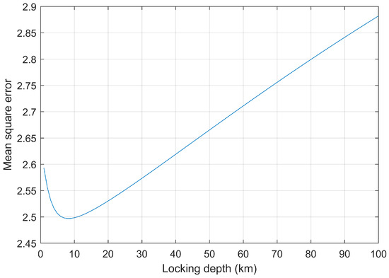 As aforementioned, the slip rate with 7.8 ± 0.4 mm/a has been derived from geodetic studies, which is merged into the model such that the interseismic fault-parallel slip rate is constant. In addition, the deep slip is assigned a constant amount, which drives the secular interseismic deformation [9,13,52]. The fault segment is locked from the surface to a variable locking depth, D, which is tuned to match the present-day GPS horizontal velocities. Figure 6 shows that the optimal value of locking depth is about 7 km, corresponding to the minimum of the mean square error. Due to the sparse near-field GPS data, the depth uncertainties can be on the order of 1–2 km. Therefore, the result reveals a slip rate of 7.8 ± 0.4 mm/a and a locking depth of 6–9 km, suggesting that the fault SDK is active with a relatively shallow locking depth.