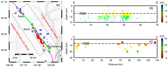 Seismicity along the SDK. (a) Red points show the aftershock distribution of the 2014 Kangding earthquake. Blue beachballs indicate the focal mechanisms of historical earthquakes (Mw ≥ 4.0) since 1970; (b) Relocated aftershock hypocenters of the Kangding earthquake are color coded with source depth. The dashed line indicates the estimated locking depth; (c) Depth profile of historical earthquakes along profile C–C’.