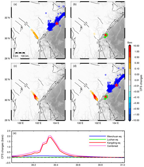 As suggested by Heidbach and Ben-Avraham [73], time-dependent seismic hazards are related to the current stress state of the active fault and its variation over time. The stress loading on the fault comes from two aspects: (1) the long-term tectonic movement of the plates; (2) the co-seismic and post-seismic stress perturbation of the adjacent earthquakes. The aforementioned results only consider the quantitative influence of tectonic loading. Thus, we also consider the CFS [3,23,24,25,52,73] caused by co- and post-seismic relaxation loading of earthquakes on the SDK (Text S2). CFS changes caused by the 2008 Wenchuan, 2013 Lushan, and 2014 Kangding earthquakes are shown in Figure 8a–c, respectively. The Kangding earthquake played a dominant role in the CFS increase of the SDK, followed by the Wenchuan earthquake and Lushan earthquake. Figure 8d illustrates the comprehensive impact of all three earthquakes on the SDK prior to 2018, and Figure 8e intuitively shows the CFS changes caused by earthquakes at different latitudes of the SDK. These results suggest that the maximum CFS increase could reach 2 bars. Shan et al. [3] reported that the sum of historical-earthquake-induced positive CFS on the SDK since 1713 is approximately 8 bars. Thus, the CFS level should have been increased much higher than the average threshold of static triggering (~0.1 bar). So, taking the slip deficit caused by fault locking and the CFS increases on the fault into consideration, the seismic hazard of the SDK is quite high, and is capable of generating an Mw ~6.6 or larger earthquake in the future.