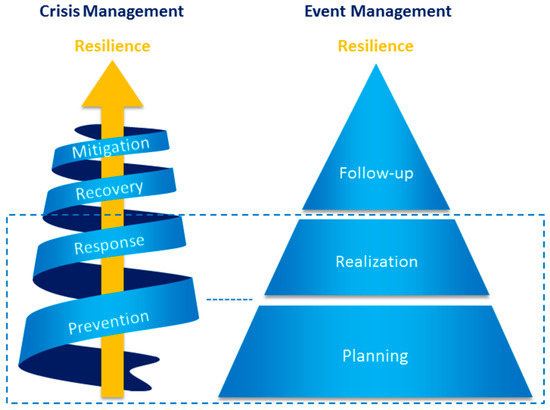 Event management can be divided into comparable main phases: planning, realization and follow-up [18] (see Figure 1). To ensure the safety of all of the participants, great effort is invested both during the planning phase and during the realization of a major event in order to identify hazards at an early stage and minimize the risks for those involved, which is in line with the preparation phase of crisis management. During the planning phase, indicators such as the height of the terrain, slopes, or depressions with a possible risk of waterlogging facilitate the routing, as well as the planning of necessary building and fastening materials. In preparation for missions, the derivation of a surface model shortly before or even during the event would make it possible to assess even temporary constructions on site, and help emergency forces prepare [13]. During the event, it is important to maintain an overview of the site and its utilization capacity [19]. The capacity (number of persons) is valuable information when it comes to the organization of supply and evacuation measures. Another main interest is access routes to the event area and the rescue lanes within the area. Automatic measurements of traffic parameters can provide comprehensive information on how delays occur, and which routes could be suitable alternative options [20]. 3D information of remote sensing data can cover large areas and can provide valuable input to improve automatic vehicle detection and classification, identify obstacles on access routes, as well as estimate the number of people on site [21]. The added value of 3D change information is to be examined in more detail in the context of this work.