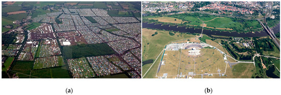 Data of two large-scale events in Germany were analyzed during this study (see Figure 3). The first was the annual Wacken Open Air music festival in northern Germany in 2016. The festival took place in a quite rural area of Schleswig-Holstein, and was attended by about 75,000 visitors and 9500 other participants. In addition to the event area with stages and supply infrastructure, large parking and camping areas were set up within walking distance of the event area. Two test sites were identified for change detection in order to represent the main structures of the camp ground with cars, tents, roads and sanitary infrastructure (see Figures 9 and 10).