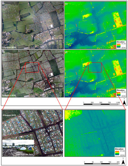The first test area of the Wacken Open Air shows a part of the campsite for mainly larger vehicles such as campers or motor homes (see Figure 9). At the first time of acquisition, the predefined areas and sections for parking and camping, as well as the previously laid out paths between them, were already visible on the aerial photographs as well as on the derived DSM. During the first acquisition, the official journey to the event had already begun, but the event had not yet been started, so large areas were still available. At the second time, the event had started, and the aerial photos clearly show the high occupancy of the camping area. In addition, it had rained heavily between the first and second overflight, which made the access roads partly muddy. A further difference is the extension of the western north–south connection, which represents a main connection axis, and was obviously intentionally kept clear and extended.