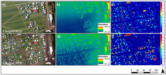 Imagery and derived DSM of Wittenberg dataset C (a and b) and Wittenberg data set D (c,d). Subsets e and f show the main event area of dataset D in detail.