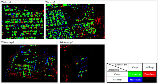 Change masks overlapped with the reference datasets for all four test regions (green: true detected; red: false alarm; blue: missed alarm).