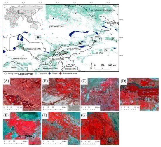 Study area. Note: Source of land cover classes: GLC global land cover of 2010 []. For the zoomed-in images: (A) fields in Karakalpakstan (KKP), (B) fields in Kzyl-Orda (KYZ), (C) fields in Almaty (ALM), (D) fields in Yining (YN), (E) fields in Bole (BL), (F) fields in Luntai (LT), and (G) fields in MNS. The land cover distributions in the upper sub-figure is based on FROM-GLC data. The zoomed-in sub-figures (A–G) are false color images from July 2016. These images have different scales because the field sizes in BL, MNS and KYZ are large, while, for the other regions, the fields are characterized as small. Thus, the zoomed-in images represent the different crop field sizes.