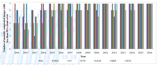 We used the Quality assurance (QA) band to mask the cloud pixels []. For Landsat-5 and Landsat-7 images, pixels with QA value equal to 66 and 68 remained as cloud pixels; for Landsat-8 images, pixels with QA value equal to 322, 324, 386 and 388 remained as cloud pixels. Next, monthly image time series were generated using the monthly maximum composition for the multi-spectral bands: blue, green, red, near-infrared (NIR), and two short-wave infrared (SWIR1 and SWIR2) bands; data availability generally increased from 2001 to 2016 (Figure 3). We then extracted two types of information from the monthly composited Landsat images: (i) information from the multi-spectral bands, and (ii) several vegetation indices calculated from the multi-spectral bands (see Table 2).