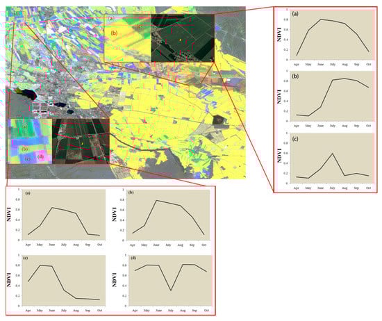 Exemplary training samples and corresponding NDVI signatures from Landsat images. The NDVI color is presented as R: NDVI in September of 2016; G: NDVI in July of 2016; B: NDVI in May of 2016. Note: We collected polygons based on very high resolution (VHR) images and visually interpreted these samples using both Landsat NDVI time series and the VHR image, and finally converted the polygons to Landsat pixels. These samples are pure pixels as they were collected in homogenous regions based on the VHR images.