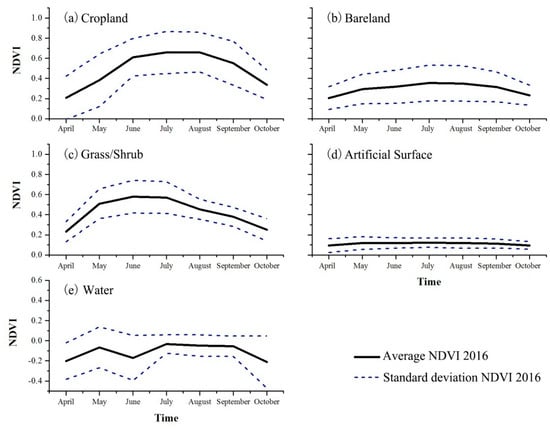Average and standard deviation of NDVI time series for each class in 2016. Note: NDVI time series of training samples of all seven study sites were used to generate this figure.