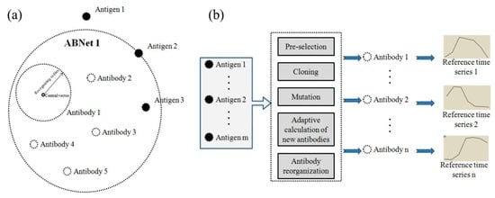 ABNet model and the procedure of generating reference time series. (a) ABNet model, (b) procedure of generating reference time series. ABNet, Antibody network.