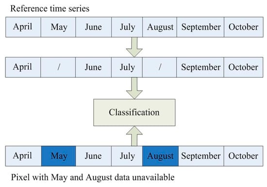 We used the reference time series to identify cropland between 2001 and 2016 annually. The classification procedure was to calculate the Euclidean distance between the vector of a pixel and the optimal feature time series of each reference time series, and the pixel was labeled as the land cover type of the antibody with the minimum distance. We were able to improve this method and solve the “missing data” problem. For example, among the seven time phases we applied in this study, if a pixel had five available time phases, we could extract the values at the “high-quality” time phase and identify the pixel with “missing data” (Figure 7). After that, we merged the Shrub/grass, Bareland, Water, and Artificial Surface as non-cropland and generated the binary cropland extent maps.