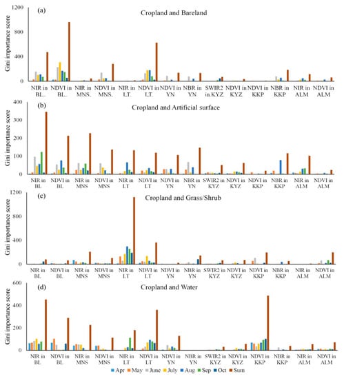 Figure 8 shows optimal features in all seven study sites and pair-wise; the Gini importance scores for all features are shown in the Supporting Material Tables S1–S7. Among all features, NIR, SWIR2, NDVI, and NBR are selected, and the NDVI is selected in all seven study sites. Among all land cover types, NDVI shows good potential to identify Cropland from Bareland and Water. For Cropland and Bareland, the Gini importance scores of June NDVI in BL and August NDVI in YN are 307.61 and 179.75, respectively. For Cropland and Water, the Gini score sums of the NDVI are 359.84 and 487.57 in YN and KKP, respectively. For separating Cropland from Artificial and Grass/Shrub, the Gini scores of NDVI are lower; for instance, the Gini score sums of NDVI in BL and MNS are 213.22 and 136.78. Besides the NDVI, the NIR band is selected as the optimal feature in BL, MNS, LT, and ALM. The NIR shows potential to discriminate Cropland from Bareland, Water, Artificial Surface, and Grass/Shrub; the Gini score sums of NIR for Cropland and Grass/Shrub are 207.97 and 1120.44, respectively, which are higher than the NDVI Gini score sums (136.78 and 104.18). NBR is selected in YN and KKP, as NBR has a high Gini score when identifying Cropland from Artificial Surface and Grass/Shrub; the Gini score sums are 147.6 and 145.25 for separating Cropland and Artificial Surface and Cropland and Grass/Shrub in YN, respectively. SWIR2 is selected in KYZ, with the Gini score sums being 51.29 and 66.55 for separating Cropland and Artificial Surface, and Cropland and Grass/Shrub, respectively.
