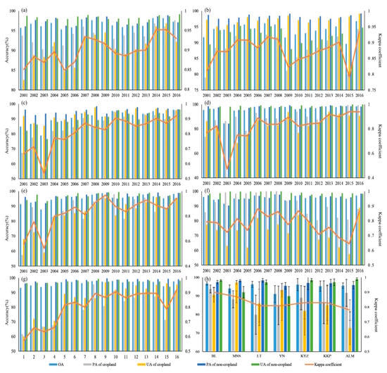 Classification accuracy of annual classifications in seven test sites. Notes: (a) BL, (b) MNS, (c) LT, (d) YN, (e) KYZ, (f) KKP, (g) ALM, (h) average and standard deviation of classification accuracy among the 16 years.