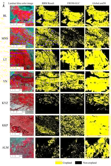 We compared the classification result of RBM and two existing 30-m land-cover products, FROM-GLC and GlobaLand30 in 2010, by classification accuracy comparison (Table 5), McNemar’s test (Table 6) and wall-to-wall comparison (Figure 10). All three products generate accurate cropland maps in BL with overall classification accuracies being higher than 95%, and PAs and UAs higher than 90%. For the other six study sites, the RBM outperforms the two existing products. In MNS, YN and KYZ, PAs of RBM were similar to GlobaLand30, and the UAs of RBM were slightly higher. Also, the accuracy of RBM was slightly higher than FROM–GLC in LT and KKP. In ALM, the UA of RBM was significantly higher than GlobaLand30 and FROM–GLC.