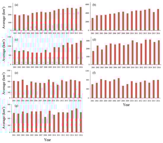 Annual change in cropland area in seven test sites in Central Asia: (a) BL, (b) MNS, (c) LT, (d) YN, (e) KYZ, (f) KKP, (g) ALM. Note: The area of cropland increased in BL, MNS, LT, and YN between 2001 and 2016, and in KKP, KYA and ALM, cropland acreage does not have the increasing trend.