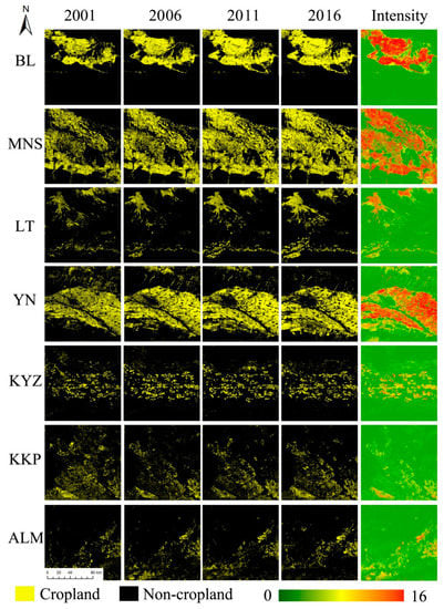 - The annual cropland maps created in this study are a useful basis for monitoring cropland distribution dynamics. Both wall-to-wall comparison and acreage statistics showed that the cropland expanded significantly in BL, MNS, and YN during the past 16 years, and the cropland in these four study regions had high cropland intensity. The cropland acreage in KYZ, KKP, and ALM have lower cropland intensity as the fields in these study regions were in rotation, and no clear expansion or shrinkage trends were observed.