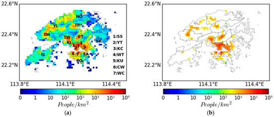 Figure 1a shows spatial distribution of population density (ρ) at a resolution of 1 km over Hong Kong. Eighteen districts of Hong Kong are marked. Consistent spatial pattern was seen between the LandScan- and census-based population data [33]. Low population densities were seen in some highly rural areas of Hong Kong. In this study, we took into account only residential areas with a population density of ≥10 people/km2. These residential areas over Hong Kong contained 804 satellite’s pixels. Mean population density (ρ0) over the residential areas of Hong Kong was about 8978 people/km2.