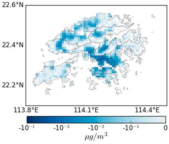 Spatial distribution of the one-grid PM2.5 change over Hong Kong.