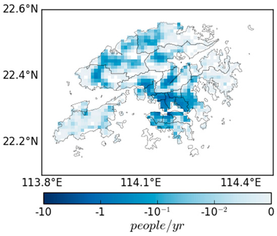 The population-weighted mean PM2.5 concentration (cρ) for Hong Kong was estimated to be 25.9 ± 1.9 µg/m3 for 2015. This cρ level still exceeded the WHO Interim Target 2 (IT-2, 25 µg/m3), IT-3 (15 µg/m3) and AQG (10 µg/m3). After we performed 804 tests that reduced PM2.5 concentration by −1 µg/m3 in different pixels, Figure 3 shows spatial distribution of the reduction of the cρ level of Hong Kong (Δcρ) for these tests. The cρ levels experienced a greater reduction when reducing PM2.5 concentration in more populated areas (e.g., central and northwestern areas). The most substantial reduction of cρ was about −0.039 µg/m3 when reducing PM2.5 concentration by −1 µg/m3 in central urban areas.