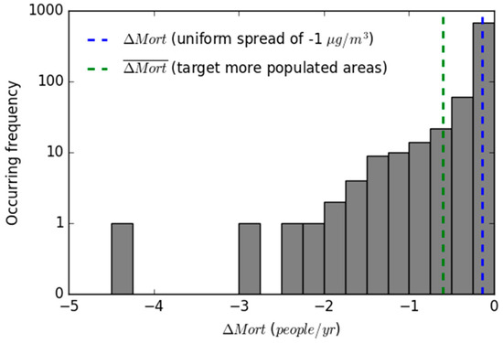 Frequency distribution of ΔMort of Hong Kong among the 804 tests. The blue-dashed line represents ΔMort when uniformly reducing PM2.5 concentration. The green-dashed line shows the mean ΔMort when PM2.5 reduction targets more populated areas.