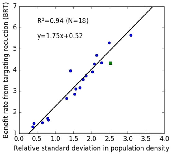 Figure 9 shows relationship between the BRT value and relative standard deviation (a ratio of standard deviation and mean) of population density for eighteen districts of Hong Kong. Each blue point represents a specific district. The green square represents Hong Kong. A high coefficient of determination (R2) of 0.94 (N = 18) with a slope of 1.75 and an intercept of 0.52 was found between the two variables. This high association indicates that the benefit resulting from targeting reduction becomes more substantial in regions with a greater spatial variability in population density.