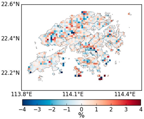 The PM2.5 and population data were mapped onto grids with the same spatial resolution of 0.01° × 0.01°. Within a specific grid, the distance between the locations of the two values was within 0.01° of longitude and 0.01° of latitude. To assess the uncertainties caused by this distance, we characterized the spatial variability in PM2.5 concentration with an interval of one grid. For a specific grid (i, j), the spatial change in PM2.5 concentration with one-grid interval was quantified by: [(PMi−1,j + PMi+1,j + PMi,j−1 + PMi,j+1)/4 − PMi,j]/PMi,j. Figure 10 shows spatial distribution of the one-grid PM2.5 change over Hong Kong. Average absolute value of one-grid PM2.5 change for all pixels over Hong Kong was estimated to be 0.93%. The grid processes of PM2.5 and population data caused an uncertainty below this level.