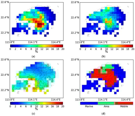 Contributions from local (a) mobile source, (b) area source and (c) marine source to PM2.5 in different areas of Hong Kong at a resolution of 3 km. (d) Type of source with a maximal contribution in different areas of Hong Kong.