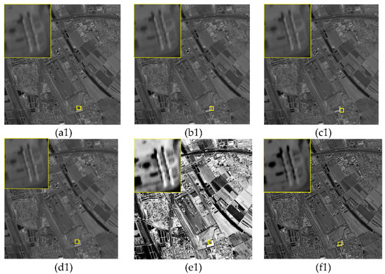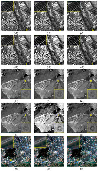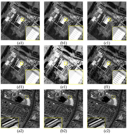 The remote sensing image obtained from the satellite was treated as the real HR image, the corresponding LR image was obtained through the simulation model Y = HK ∗ X + N, where Y represents the simulated LR image, X is the original remote sensing image, N represents the noise, K the fuzzy convolution kernel, H is the down-sampling matrix, * representative convolution operation. The type of subsampling is bilinear that was used to decrease the size of the original images. In this experiment, the scaling factor = 2, three layers were used in the algorithm to decompose the images. The result based on the typical and state-of-the-art SR reconstruction methods were compared with our SR method. Due to a limitation of space, the simulation experimental results with random noise with the range of [−2, 2] were shown in Figure 4.