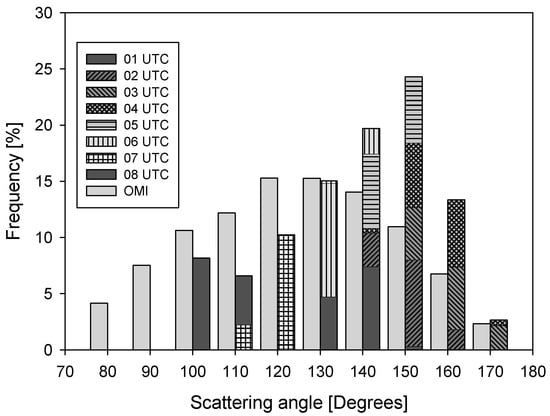 Figure 1 shows the frequency distribution of the scattering angle in the viewing geometry of GEMS and OMI. Compared with OMI, the scattering angle of GEMS has a narrower distribution that shifts towards the backscattered direction over time. However, the cross-track measurements of OMI cover a wider scattering-angle range than do GEMS measurements. This comparison indicates that, in regard to angular coverage, LEO measurements can be used as a proxy for GEO measurements.