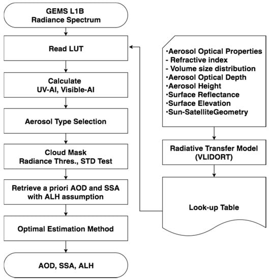 In this section, the current algorithm is described in the order of LUT construction with aerosol model and retrieval process based on OE with a priori. The aim of this algorithm is the retrieval of AOD and SSA. To improve retrieval accuracy and to make the algorithm standalone, ALH is simultaneously retrieved with the AOD and SSA by fitting the reflectance spectrum from simulations and observations.