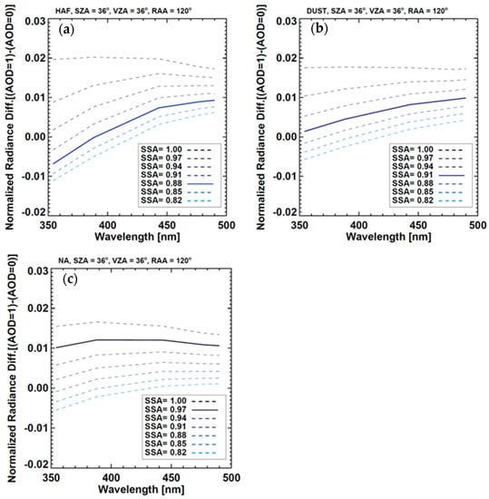 Spectral difference in normalized radiance (N) for pristine (AOD = 0) and polluted (AOD = 1) conditions with respect to aerosol type: (a) HAF, (b) dust and (c) NA. Colors indicate SSA and solid lines show the average SSA obtained from integrated AERONET inversion data for each type.