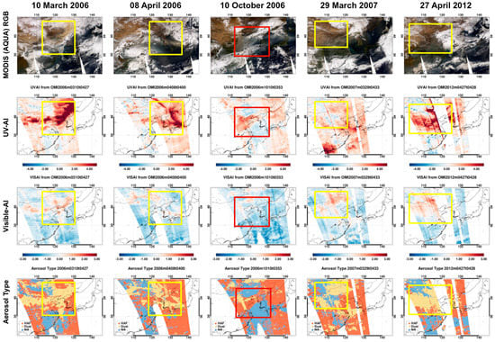 RGB images observed from MODIS (Aqua), UVAI, visible AI and aerosol type calculated from OMI measurement on 10 March 2006, 8 April 2006, 10 October 2006, 29 March 2007 and 27 April 2012. Yellow and red boxes indicate dust and HAF scenarios, respectively.
