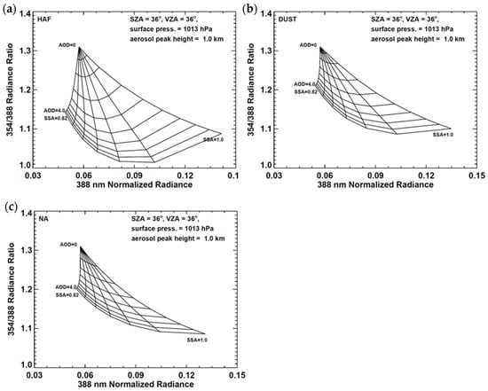 Example of LUT used to estimate a priori AOD and SSA for three different aerosol types: (a) HAF, (b) Dust and (c) NA. The x-axis represents the normalized radiance at 388 nm and the y-axis represents the ratio between the radiances at 354 nm and 388 nm.