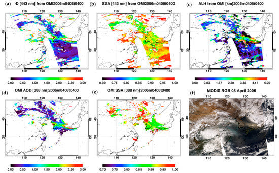 Example of retrieved (a) AOD, (b) SSA and (c) ALH. The upper panels show the products of the proposed algorithm and the lower panels show the (d) AOD and (e) SSA of the OMI near-UV algorithm and an (f) RGB image from MODIS on 8 April 2006.