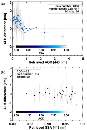 In Figure 8a, the differences and retrieved SSA are sorted according to retrieved AOD and divided so as to have the same number of data points in each bin. While mean ALH difference and its standard deviation are represented by symbols and error bars, respectively, the mean SSA is shown by color. The horizontal error bar represents standard deviation of AOD for each bin. The ‘binsize’ in Figure 8 shows the number of data points in each bin. As shown in Figure 8a, the retrieval error in ALH decreased as the AOD increased from 0.0 to about 0.8, because the contribution of ALH to the normalized radiance increases with aerosol extinction. When the AOD is between 0.8 and 2.0, the mean difference between the ALH and CALIOP Zaer is close to 0.0 km with a standard deviation of about 1.0 km. However, the ALH error increases negatively with increasing AOD in the high-AOD range. It should be noted that data points in the high-AOD bin may be affected by cloud contamination, contributing to the high mean value. In this case, Zaer would be overestimated due to the increase in the backscatter coefficient from high cloud layers and ALH would be underestimated because of the underestimated radiative absorption of aerosols. The high SSA of 0.96 for the highest AOD bin suggests frequent cloud contamination.