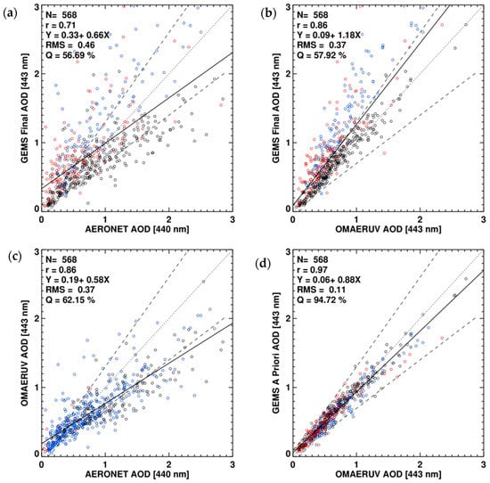 Following Ahn et al. [], the AOD and SSA products are quantitatively compared with AERONET values and their accuracy is assessed using statistics of linear regression such as correlation coefficient (R), root-mean-square error (RMSE), slope (a), y-offset (b) and the Q value, which shows data points within a 30% error range.