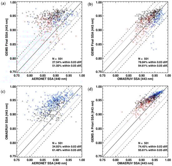 Comparison of (a) GEMS and AERONET SSA, (b) GEMS and OMAERUV SSA, (c) OMAERUV and AERONET SSA and (d) GEMS a priori and OMAERUV SSA (443 nm). Colors indicate the aerosol type distinguished by the satellite algorithm shown on the y-axis. Black: HAF (smoke for OMAERUV), red: dust and blue: NA. Dashed and dotted lines indicate an uncertainty envelope of ±0.05 and ±0.03 in SSA, respectively. Black solid lines are 1:1 lines.
